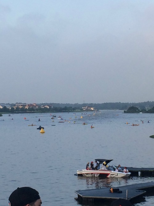 The gun for the pro race went off at 6:25 and that started the countdown to the age group start at 6:40. Everyone began lining up, I gave Sam and my dad one last hug and I started the slow walk towards the water’s edge. Once I crossed the mat and hit the very chilly 81 degree water, my nerves subsided and it was go time.